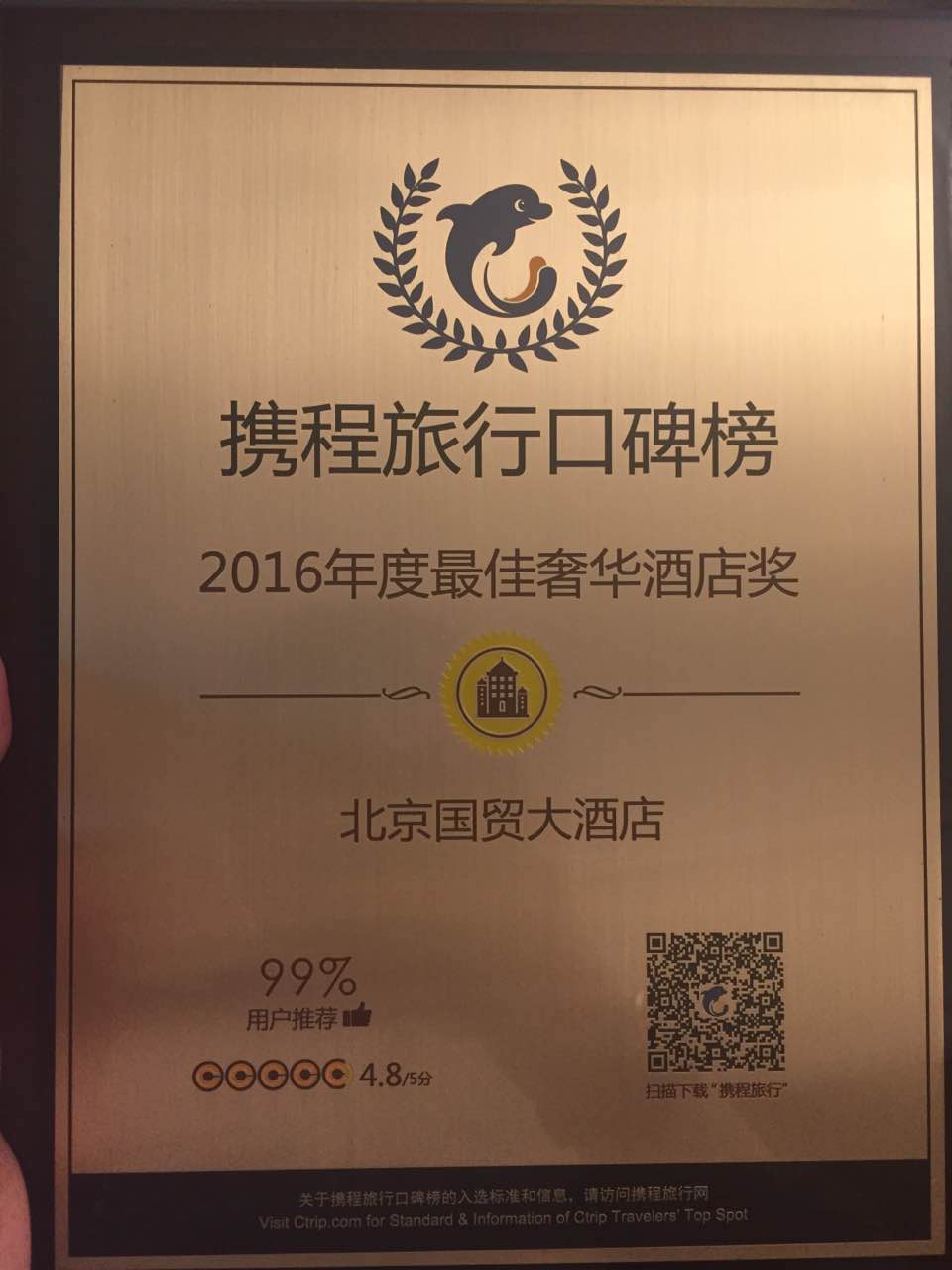 携程旅行口碑榜2016年度最佳奢华酒店奖