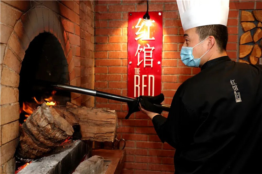 在红馆,果木挂炉烤鸭是食客们逢到必点的招牌菜,很多回头客都是奔着冯驰师傅的烤鸭而来。透过大大的玻璃屏风墙,随时可以看到高大帅气的冯驰师傅在烤鸭间忙碌。