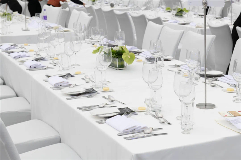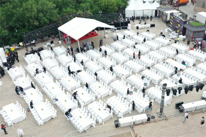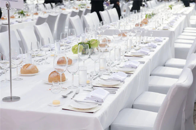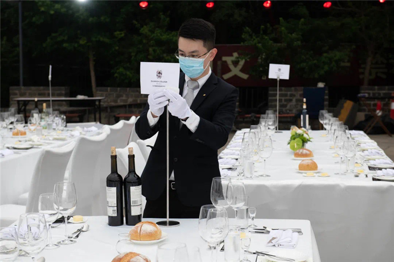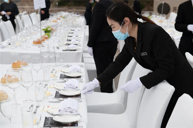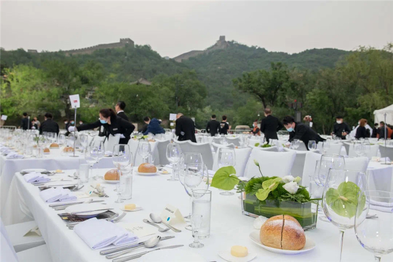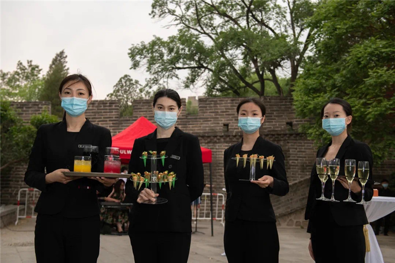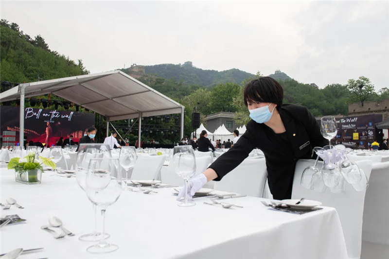 5月22日上午艳阳高照,摆台进行中,烈日下宴会同事挥汗如雨。一张张白色桌椅排成方阵,一如接受检阅般,列于长城脚下,在蔚蓝天空和葱郁群山的映衬下,颇为壮观。即便有充分准备,现场突发状况仍是层出不穷。下午4时许,风起云涌,餐桌上摆好的玻璃杯摇摇欲坠。餐饮部副总监张涛马上指挥大家将杯子倾斜搭放,避免被风吹落;紧接着零星的雨点随风而至,提前备好的苫布正好派上了用处。正式开场前,全体员工又以飞快的速度将它们放回原位,桌台全部按照标准摆放。