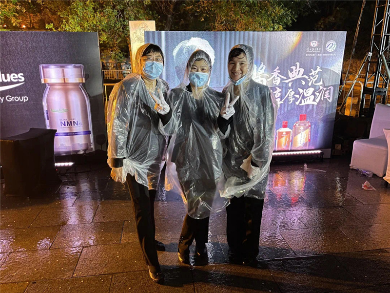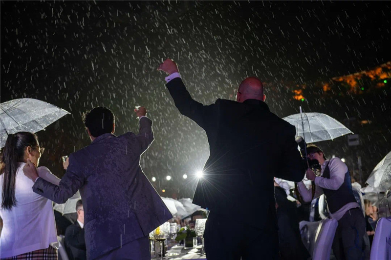 在所有突发因素中,天气变化恐怕是最大的挑战。当第三道主菜即将上桌时,寒风乍起、大雨如注。这时,服务同事毫不犹豫地将提前备好的雨披雨伞等让给了盛装的宾客并帮助有需要的贵宾移步雨棚下。现场秩序井井有条,全体服务人员将酒店人的精气神儿展现得淋漓尽致,越是在困难时刻,越能够稳住状态,以专业的技能,一丝不乱的态度,乘着风雨继续以微笑迅速恢复了现场的服务流程。也正因为员工稳定出色的表现,大多数客人选择撑起雨伞把酒言欢,畅享美食。