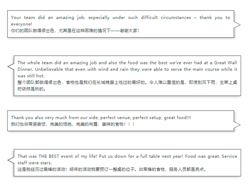 当宴会部最后一批同事将桌椅装车离开长城返回酒店时已是23日清晨。稍事休整的他们,即将奋战另一个“战场”——当日在酒店举办的700人会议和两场200人宴会。经历了长城外卖这场战役磨砺的酒店人更多了几份从容,因为我们坚信:团结合作、使命必达。