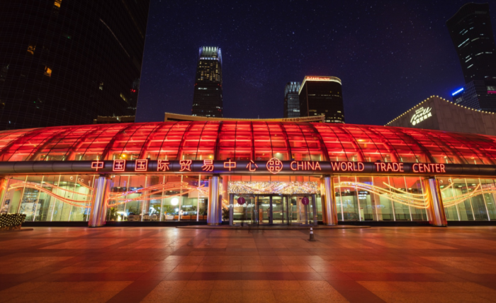 作为国贸中心长安街沿线的主点位,南大门整体灯光以金色为主色调来体现“金十字”这个主题,通过灯光的明暗变化展现出丰富的层次感;顶部采用渐变的染色灯进行色彩晕染;立面玻璃饰有金色艺术线条,与流动灯光相互映衬,仿佛龙在腾飞,显得气势非凡;六根立柱以金色镂空花纹金属装饰包裹,内置金色暖色灯光,整体呈现流光溢彩的节日效果。