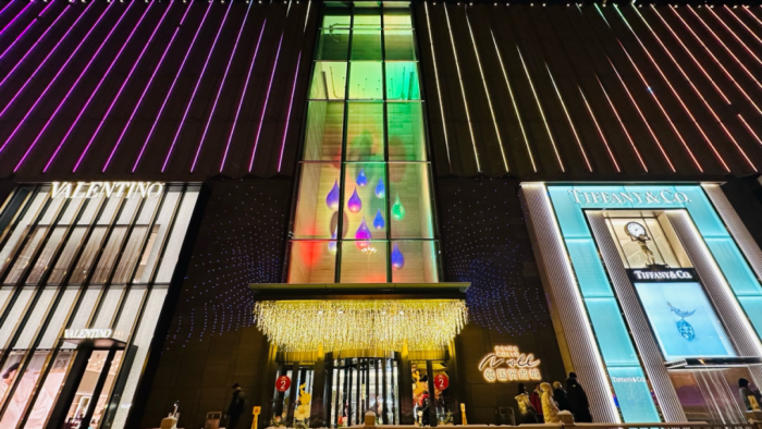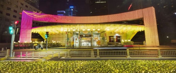 结合“银河落九天”艺术装置,两侧楼体以星空灯营造星光璀璨的银河,中间门头用自然垂落的灯帘以及白色闪烁灯珠点缀,多种灯饰汇聚一起,整体打造出璀璨闪耀、浮光耀金的效果。