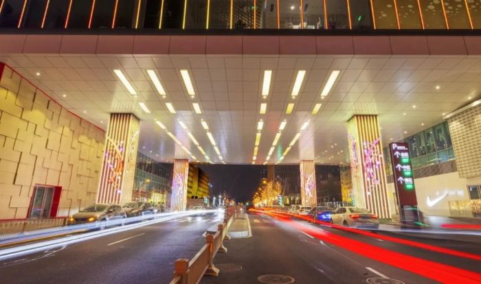 流光闪耀的灯条装饰,搭配蜿蜒的曲线造型及闪烁的灯帘,使整个拱廊“龙游九天,盈熠生辉”。