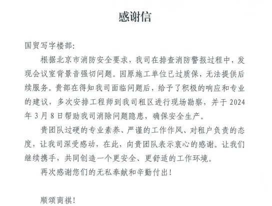 注:租户致国贸中心写字楼部物业团队的表扬信