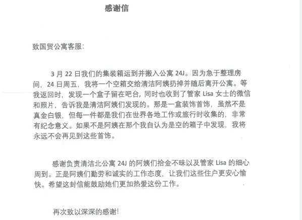 从1990年开业至今,国贸公寓见证了无数故事:有的租户从这里开启了他们的婚姻生活,有的家庭在这里迎来了新生命的降临。而这一切,都离不开这群默默付出的管家们。正如一位租户所说:“在国贸公寓,我们不只是找到了一处住所,更找到了家的感觉。”