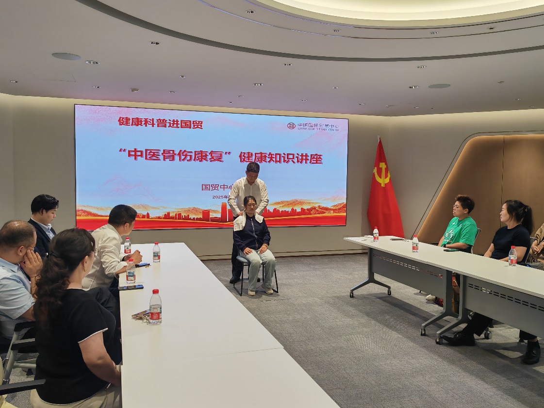 7月9日下午,中心工会举办“健康科普进国贸”健康知识讲座第二讲,邀请“平乐正骨”非物质文化遗产项目传承人、国贸医务室宋继元医师,为国贸员工带来中医骨伤康复健康知识讲座,现场教授大家通过日常按摩穴位和功法练习疏通经络、缓解肌肉痉挛、改善椎间盘供血等病症的方法,并为部分员工进行正骨治疗。