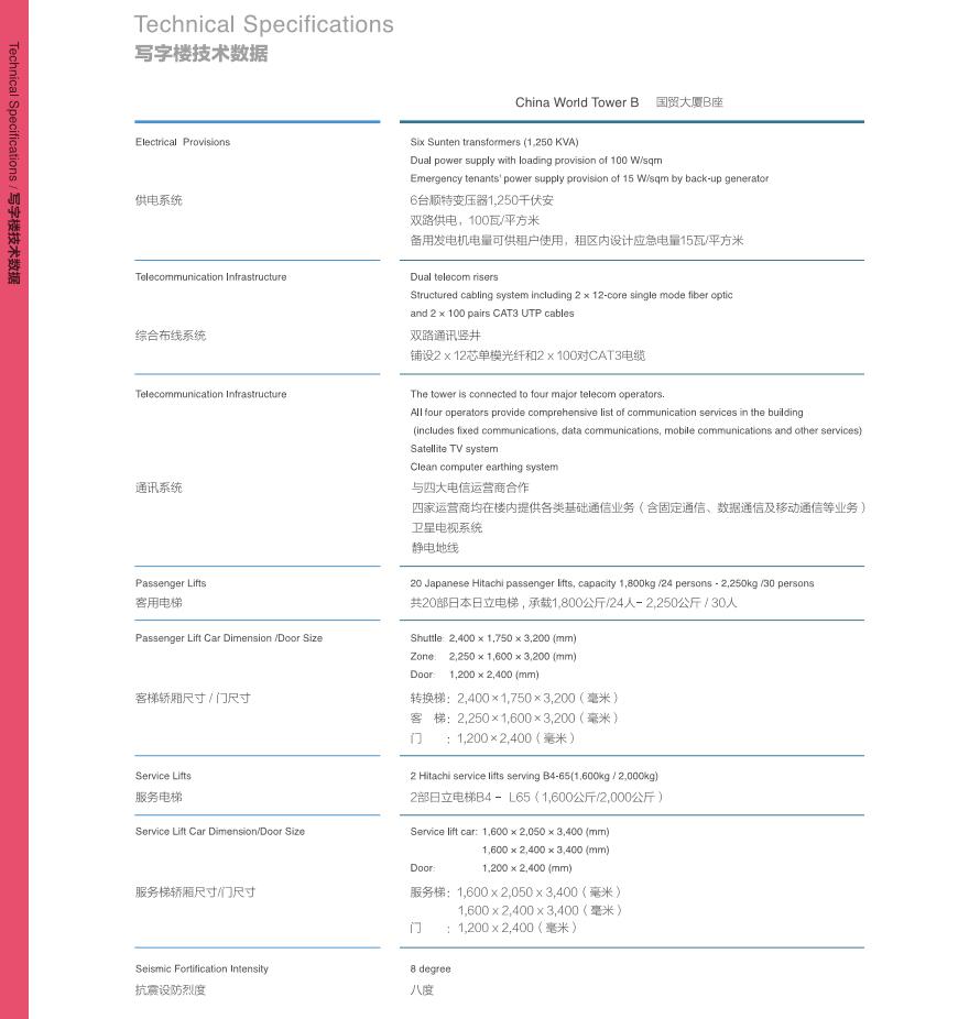 China World Tower A and B are equipped with 4-pipe variable-air-volume (VAV) system including ultra-violet air purification technology to provide year-round cooling and heating comfort for our tenants. Fresh air quality is ensured by direct fresh air intake and forced exhaust air system in all office buildings. Dedicated 24 hours chilled water is provided for tenants’computer server rooms.
