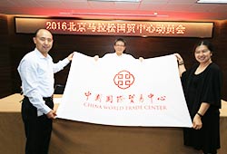 2016北京马拉松新闻发布会在中国大饭店举行。国贸中心与2016北京马拉松的承办单位中奥路跑(北京)体育管理有限公司正式签约,成为官方赞助商。国贸中心钱晓瑾副总经理,钟荣明副总经理,中国大饭店总经理谢国林先生出席了签约、授牌仪式。